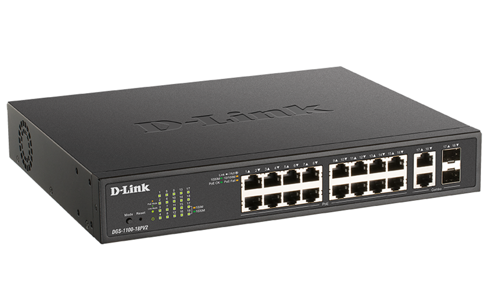 D-Link 18-Port Gigabit Smart Managed Switch with 16 PoE+ and 2 Combo RJ45/SFP ports. PoE budget 130W.